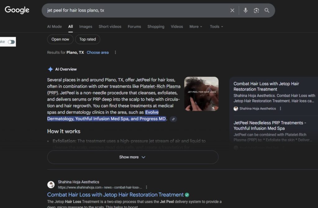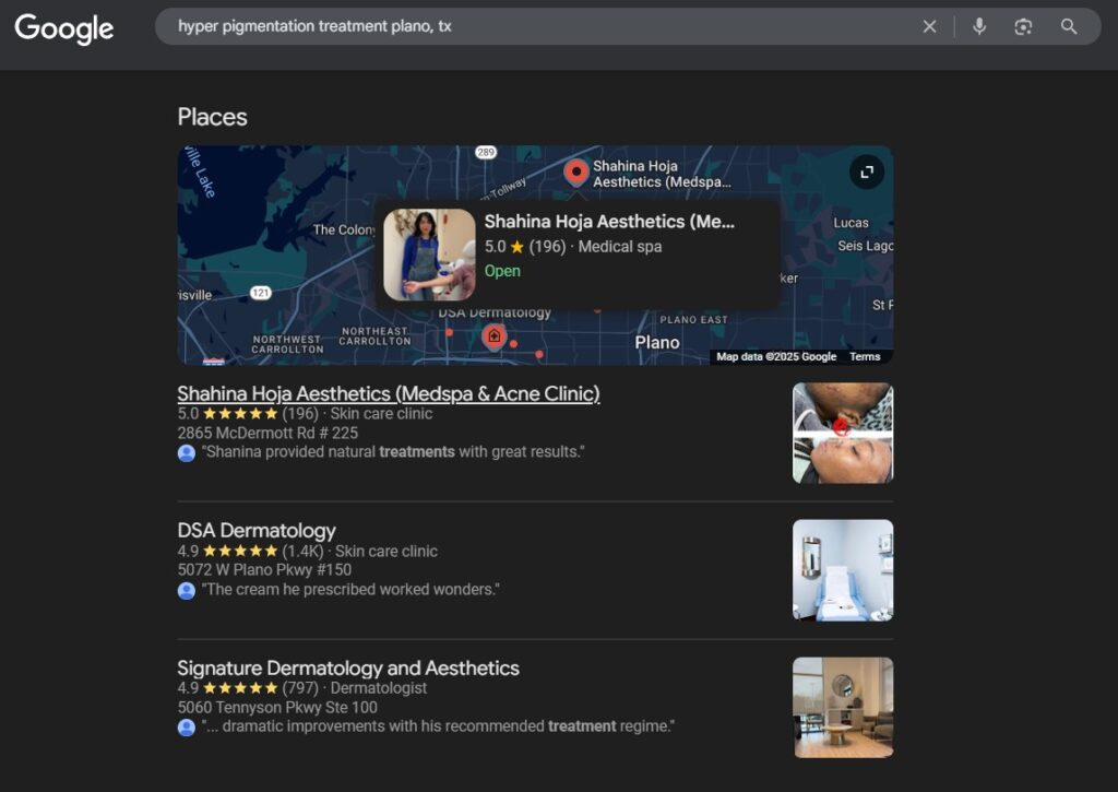 - Improve Google rankings for high-intent local keywords like “medical spa Plano TX,” “Botox Plano,” and “laser hair removal Plano.”
